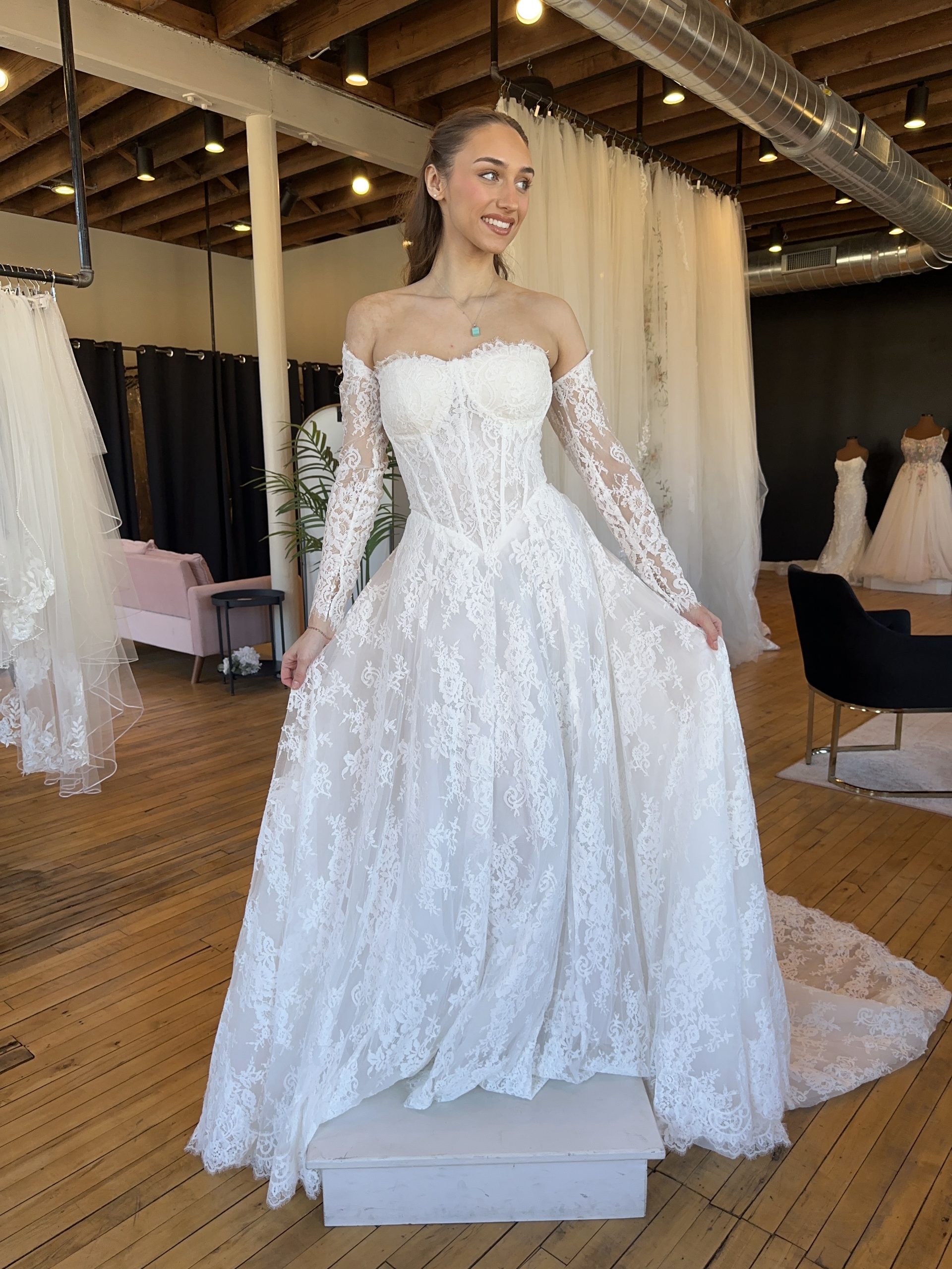 For the bride who dreams of soft elegance and enchanting details, Callie Rae Bridal delivers. Exclusive to Bon Bon Belle, these gowns are crafted with ethereal lace, flowing tulle, and a touch of whimsy to capture your love story. These gowns are just a peek; reserve your bridal appointment to try on the full selection from this designer in our boutiques.